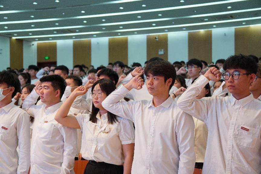 老学员代表颜承旭同学和新学员代表石璞璇同学先后发言。在石璞璇同学的带领下,全体新学员宣誓,誓言铿锵有力,一句一句的誓言代表着学员们一步一步向党靠近的决心。