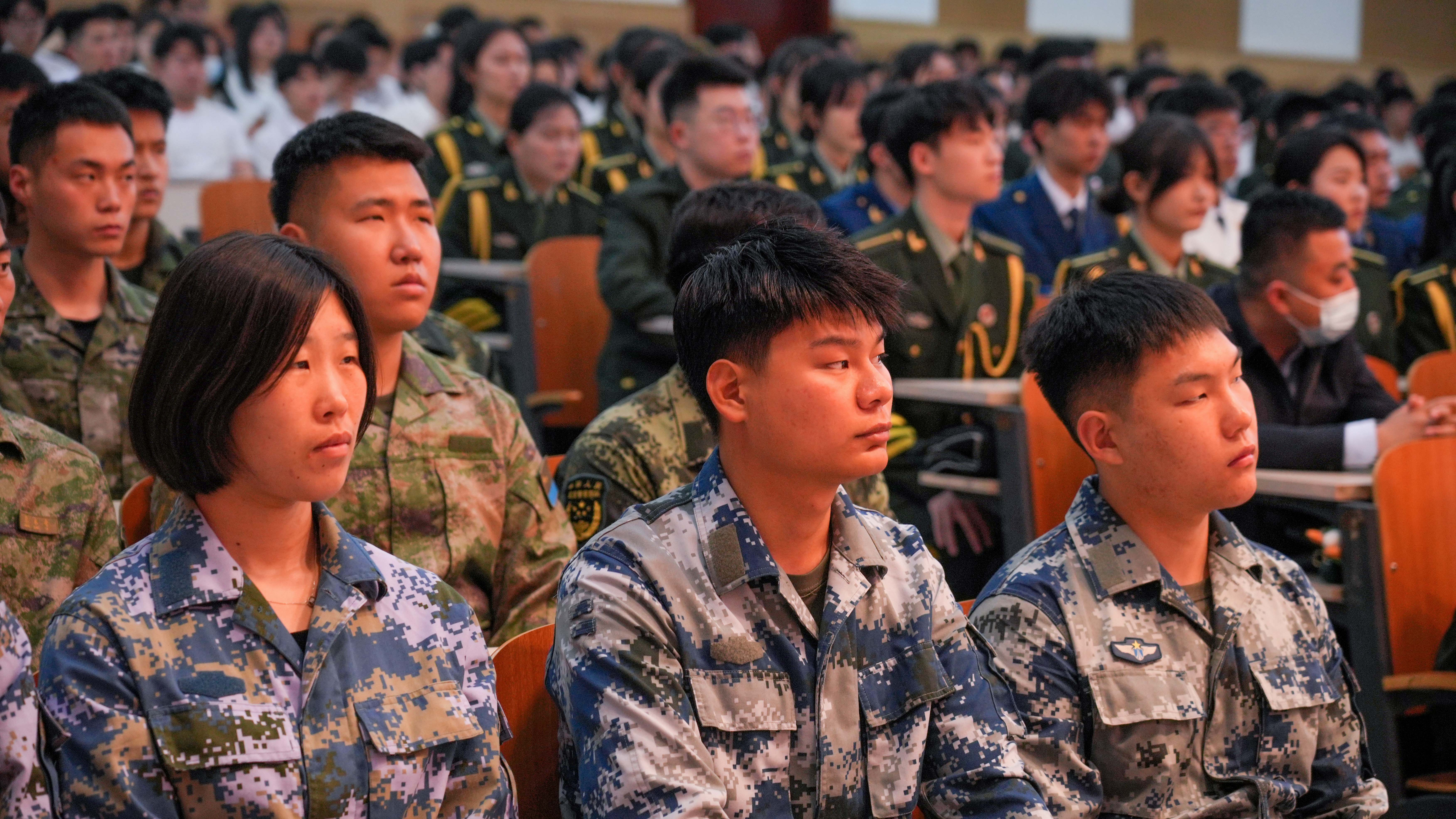 最美大学生士兵代表——燕京理工学院国旗护卫队队长郝帅、曾服役于中国人民解放军北部战区和驻香港部队的燕京理工学院退役士兵王伟和李铮现场分享了自己的从军经历,鼓励同学们积极参军入伍,报效祖国。