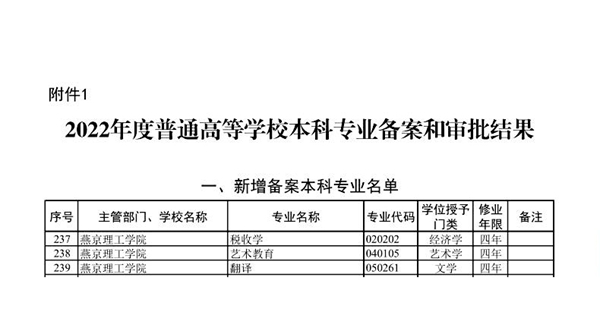 本网讯(教务处 李丽荣)近日,教育部公布了2022年度普通高等学校本科专业备案和审批结果。燕京理工学院2022年度申请增设的税收学、艺术教育、翻译3个本科专业获批准,这意味着燕京理工学院2023年将新增3个本科专业。