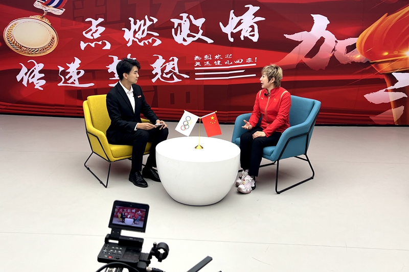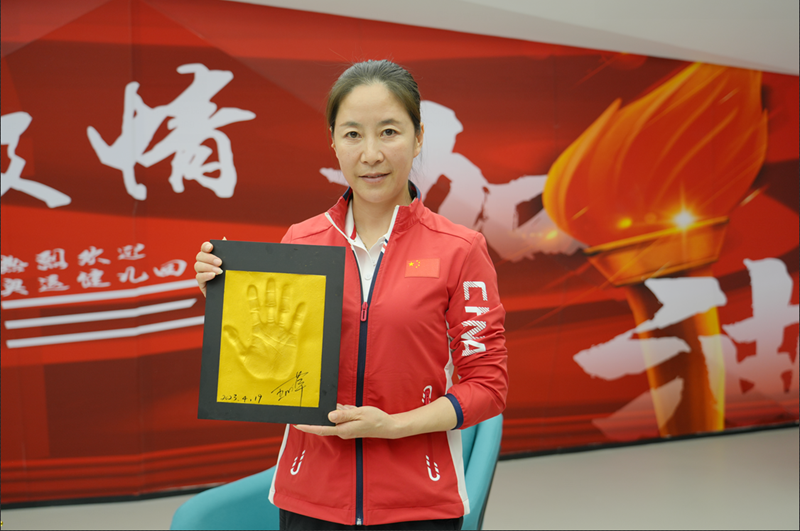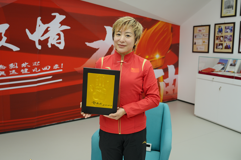 在体育博物馆,王丽萍、郭丹丹在金色印泥上按下“金手印”并签名,成为首批入驻燕京理工学院“体育名人坊”的两位世界冠军。学校播音与主持艺术专业学生徐承泽对两位世界冠军进行了“名人专访”,分享了以体育圆梦世界的故事。