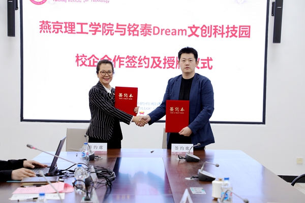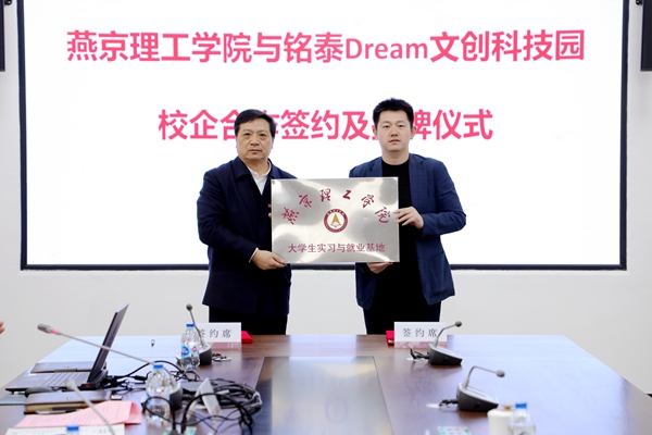 刘元园副校长和铭泰Dream文创科技园总经理马东代表校企双方签订校企合作协议,杨庚宇校长为铭泰Dream文创科技园授予燕京理工学院大学生实习就业基地牌匾。