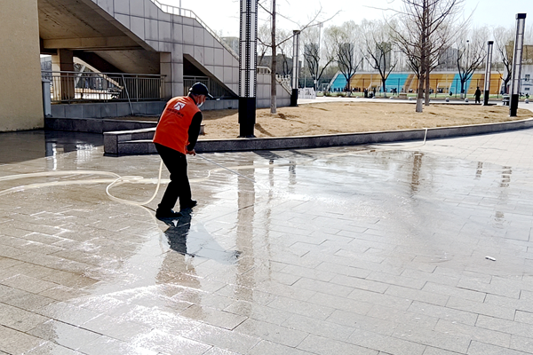 保洁板块组织保洁工作人员对综合楼、体育馆、图书馆、教学楼台阶、商业街和全校主要路面进行清洗冲刷、清理校园卫生死角和垃圾,严格按照保洁服务标准和操作要领要点,严把保洁服务质量关。