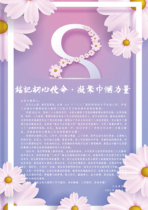 本网讯(党委办公室 郭雯)值此“三八”国际劳动妇女节,燕京理工学院向全校女教职工致以节日的问候和崇高的敬意!