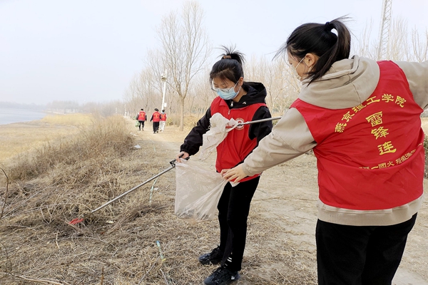 雷锋连成员和志愿者们在潮白河进行志愿服务活动