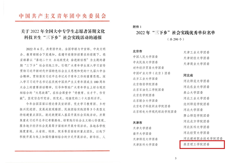 本网讯(团委 学生处 王奥然 王欣钰)10月11日,共青团中央青年发展部发布《关于2022年全国大中专学生志愿者暑期文化科技卫生“三下乡”社会实践活动的通报》,燕京理工学院团委获评2022年“三下乡”社会实践优秀单位。