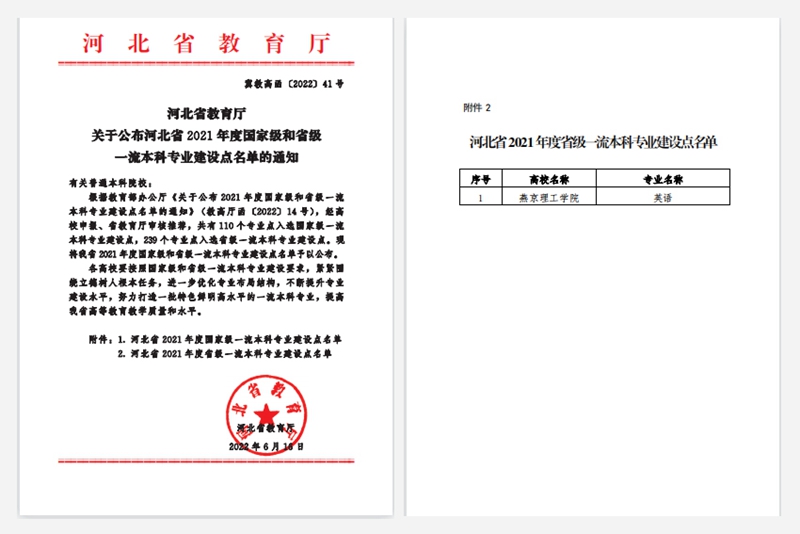 本网讯(宣传部 文法学院 徐鑫 祝婧琦)根据《河北省教育厅关于公布河北省2021年度国家级和省级一流本科专业建设点名单的通知》(冀高教函〔2022〕41号)文件,燕京理工学院英语专业正式获批成为省级一流专业。至此,与2019和2021年获批的法学、会计学、物联网工程、物流管理、制药工程、产品设计、自动化、审计学、视觉传达设计9个本科专业,燕京理工学院已有10个省级一流本科专业建设点。