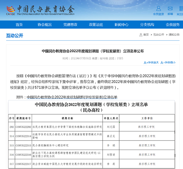获批立项的5项课题分别为在刘元园申报的《民办教育集团化办学背景下高校体教融合实施路径研究》,高正见申报的《论数字体育在民办高校大学生体质健康智慧管理模式中的影响》,李娟申报的《民办高校融媒体中心建设研究》,刘雪凌申报的《新业态下民办高校课程群智慧教学团队建设范式研究-以燕京理工学院为例》,李莉申报的《政企资本赋能中国民办大学教育发展升级的有效途径研究》。