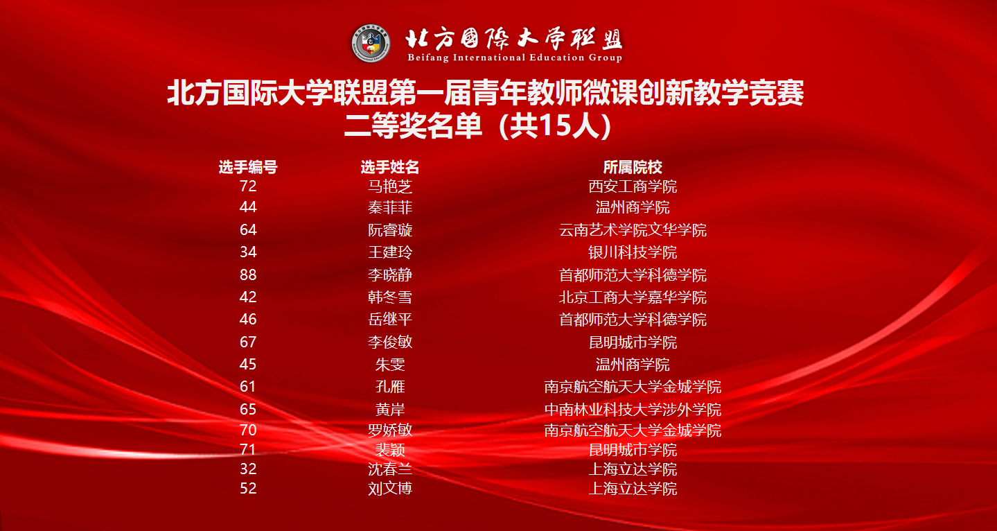 燕京理工学院副校长吴汶燕宣布大赛“优秀组织奖”获奖院校。燕京理工学院、昆明城市学院、南京航空航天大学金城学院、首都师范大学科德学院、西安工商学院获得北方国际大学联盟第一届青年教师微课创新教学竞赛“优秀组织奖”。