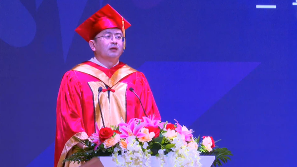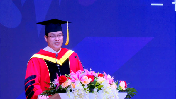 杨庚宇校长代表学校向圆满完成学业的毕业生表示最热烈的祝贺,向为培养同学们成长成才付出辛勤汗水的老师表示崇高的敬意,向长期以来关心支持学校发展的学生家长、校友和社会各界朋友表示衷心的感谢。典礼上,他回顾了漫漫求学路上,同学们用青春汗水书写的大学学习阶段精彩篇章,细数了伴随着同学们的成长成才学校事业取得的长足进步。