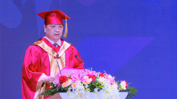 “同学们,此时是你们在校最后一课,即将踏上人生新的征程,衷心希望你们按照习近平总书记前不久对青年学生提出的要求,牢记党的教诲,立志民族复兴,不负韶华,不负时代,不负人民,在青春的赛道上奋力奔跑,争取跑出当代青年的最好成绩。”校长杨庚宇发表热情洋溢的讲话,送上饱含深情的临别寄语。