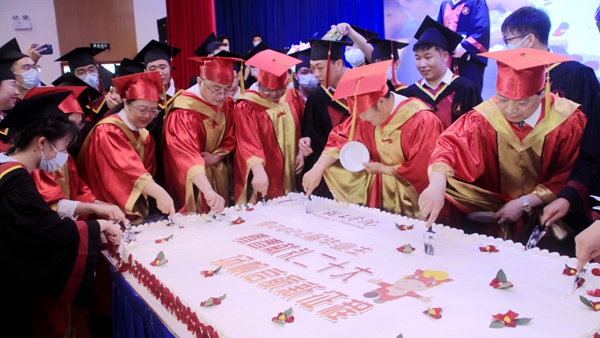 学校领导为毕业生切分蛋糕,送上毕业祝福