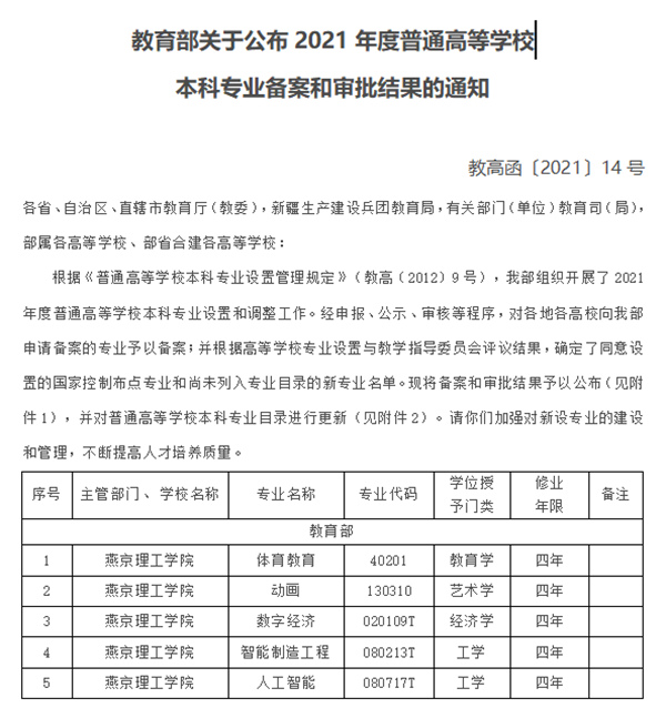 本网讯(教务处 李丽荣)近日,教育部发布了《教育部关于公布2021年度普通高等学校本科专业备案和审批结果的通知》(教高函〔2021〕14号),燕京理工学院申报增设的体育教育、动画、数字经济、智能制造工程、人工智能5个本科专业成功获批。