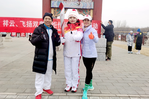 刘元园副校长与北京2022冬奥会火炬手张颖、北京2008奥运火炬手刘超英在一起