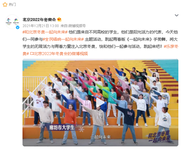 本网讯(记者 赵树金 体育、文法、艺术学院供图)“我们都拥有爱,来把所有门全都敞开,Together for a shared future,一起来,Together,一起向未来!”2021年11月,燕京理工学院组织师生在校园一起唱响北京冬奥会主题曲,跳起青春版《一起向未来》手势舞,经学校官方抖音平台发布后,被北京2022年冬奥会和冬残奥会组织委员会官方微博@北京2022年冬奥会 采用并发布,作为全国高校学生代表,展现大学生的无限活力与青春力量。