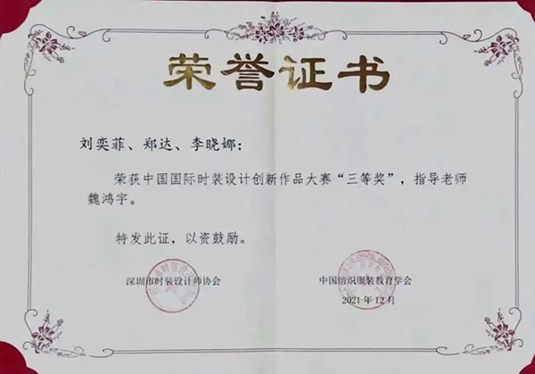 荣获中国国际时装设计创新作品大赛全国三等奖 指导老师:魏鸿宇