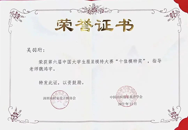 服表2001 吴羽珩 荣获中国大学生服装模特大赛总决赛“十佳模特奖” 指导老师:魏鸿宇