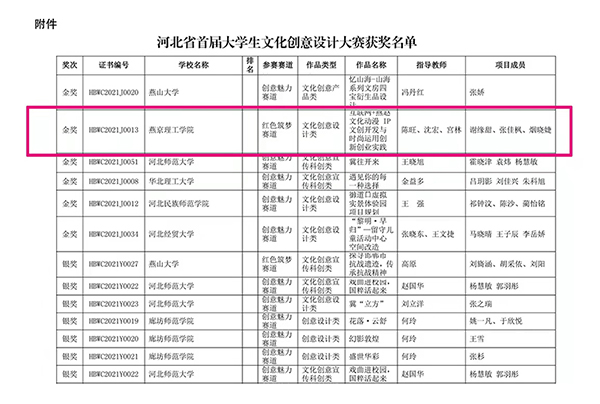本次荣获创新创业项目的“金奖”,不仅展现了我校艺术专业从设计到产品策划、推广的综合实力,更进一步激发了我校大学生创新潜能和创造活力,提高了我校大学生对燕赵传统文化及数字动漫IP研究的学习能力、挖掘能力、创新能力。