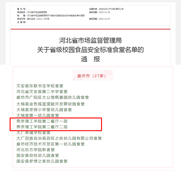 本网讯(后勤资产处 梁哲)近日,我校第二食堂被河北省市场监督管理局评定为“2021年度省级校园食品安全标准食堂”,是三河市唯一获评的单位,也是廊坊市两个获评此荣誉的高校之一。我校食堂严格按照《河北省校园食品质量安全水平提升三年行动计划(2019-2021年)》工作目标和任务要求,对标“A级标准”进行不断建设和优化。