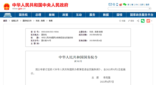 现公布修订后的《中华人民共和国民办教育促进法实施条例》,自2021年9月1日起施行。