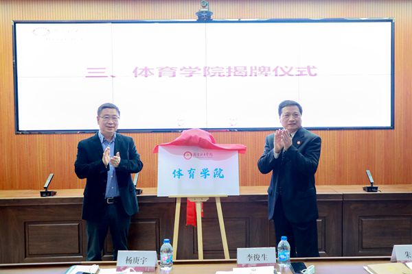 理事长李俊生、校长杨庚宇在相关校领导与体育学院全体教职工的见证下,为体育学院成立揭牌。