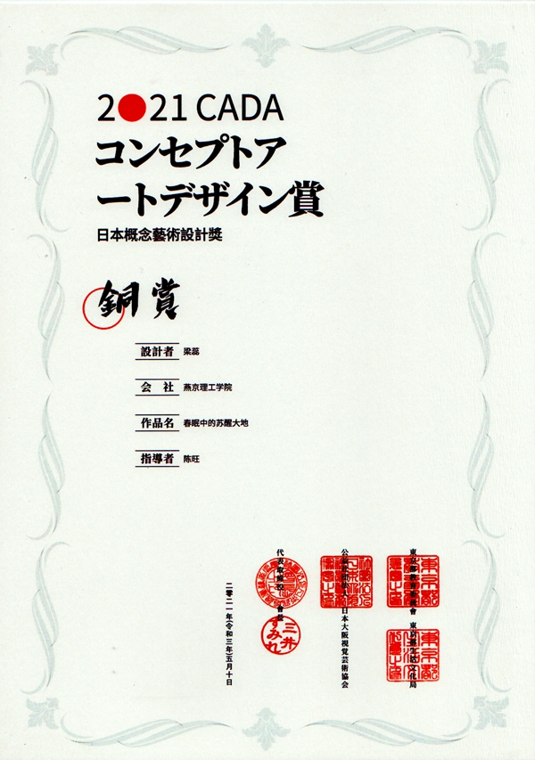 本网讯(艺术学院 陈旺)近日,燕京理工学院进入2021 CADA日本概念艺术设计奖(中国赛区)获奖名单,艺术学院学生设计作品经过国际预赛、初赛、复赛的层层选拔,在国内参赛院校中脱颖而出,获得2021年度国际专业赛事大奖1银2铜的好成绩。