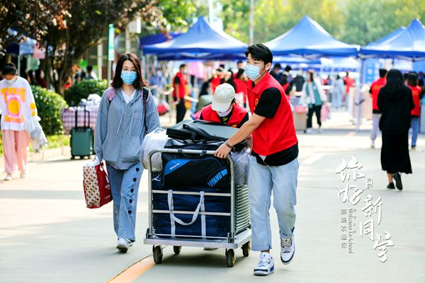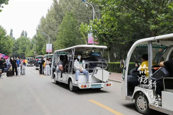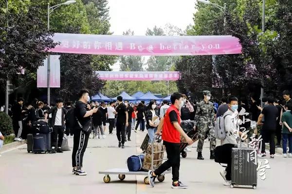 在热闹的学校东门,2021级新生们在老师及相关工作人员的组织下,有序进入学校,校园中随处可见志愿者们协助新生搬运行李,办理入校手续、饭卡等,并带领新生熟悉校园环境的场景,积极做好新生“一站式”服务。同时,学校专门调度十余辆摆渡车,配备训练有素的驾驶员,自校门到宿舍之间接送新生,协助新生运送行李与生活用品。