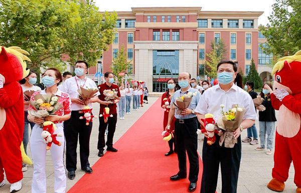 9月18日上午,校长杨庚宇,党委书记朱代春,党委常务副书记、副校长刘元园,党委副书记、副校长王传超,副校长吴汶燕、宋伟在迎新班车接待处集体欢迎2021级新生的到来。伴随生命与健康学院合唱团同学们的歌声,校领导们集体向新生送上花束并合影留念。