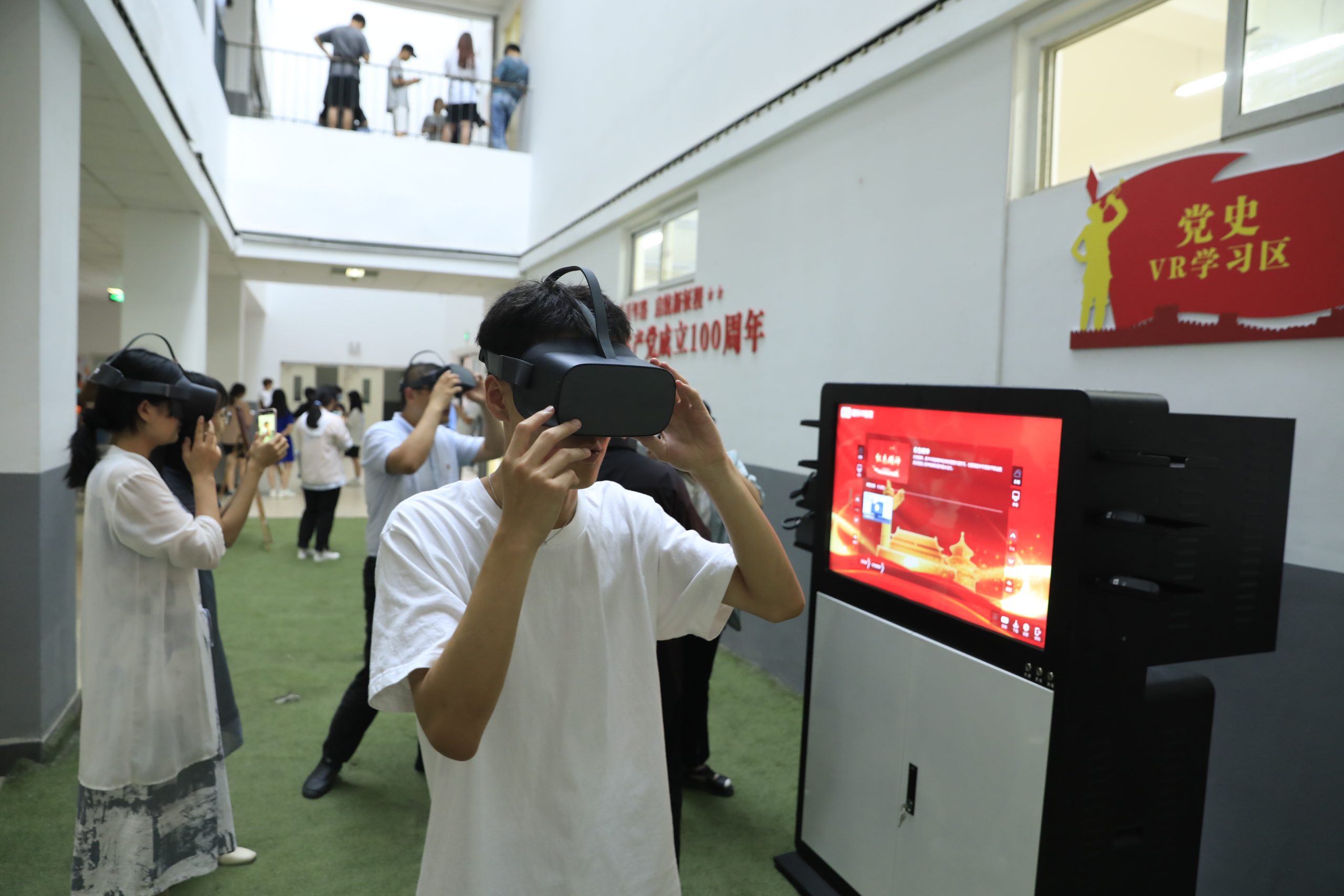 在党史VR学习区,大家纷纷带上VR眼镜,在“百年党史 光辉历程”VR网上展厅,近距离感受纪念馆和真实革命圣地带给大家的震撼。“下午我考的就是《中国近现代史纲要》,这个正适合复习,收获满满。”“我要预约3小时,好好走一走党的百年奋斗路。”“这样的党史学习,是新时代学习该有的样子。”1日中午,同学们在考试后、午休时,看到已经调试完成,面向大家开放的党史VR设备,纷纷加入其中,开始党史学习体验。