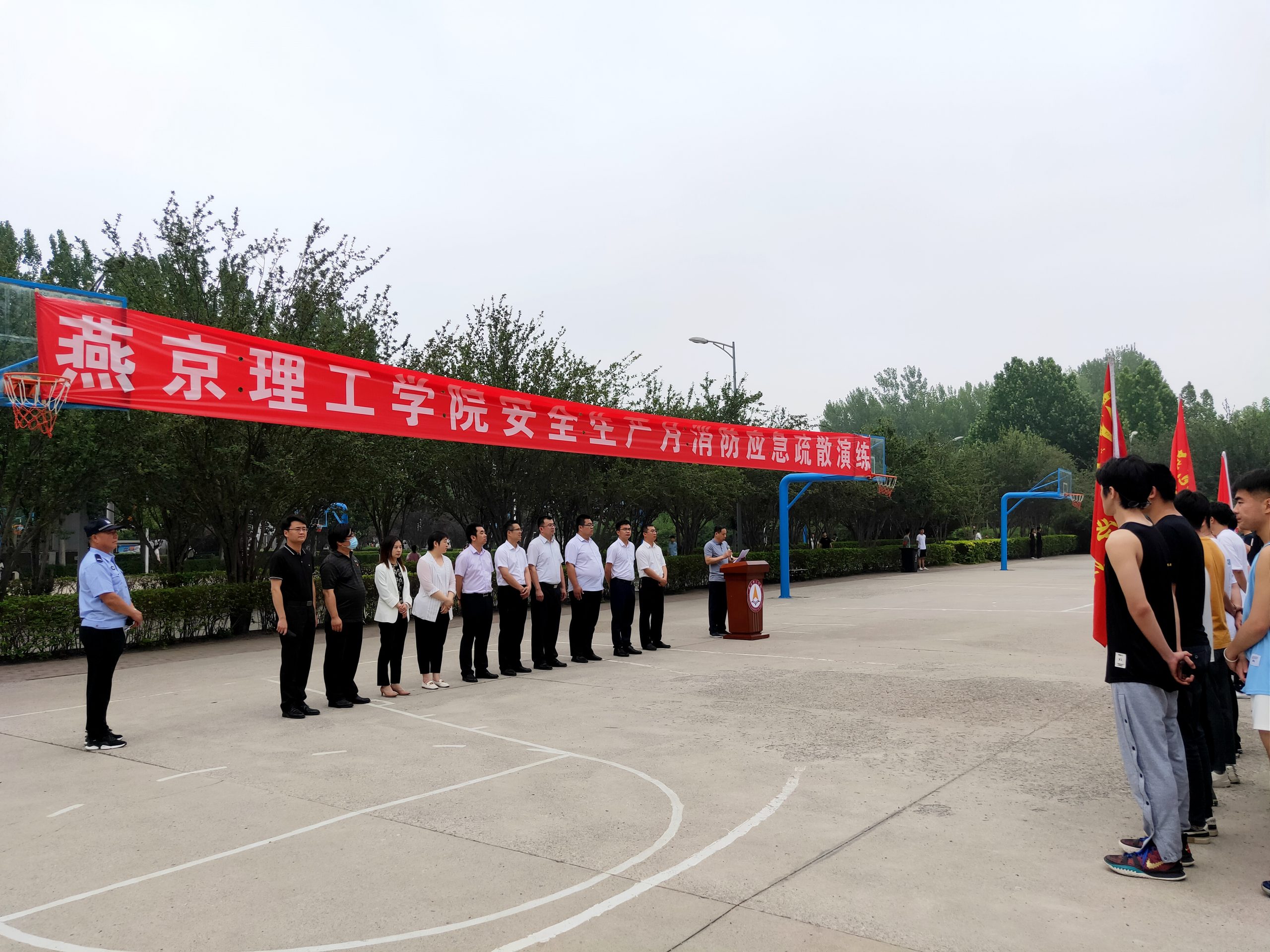 6月23日,由安全处和后勤资产处联合组织的餐厅工作人员消防演习在学校篮球场如期举行。
