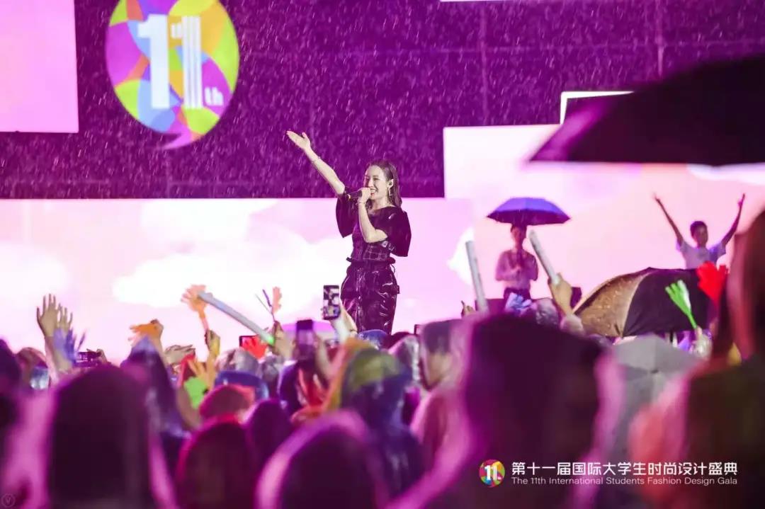 “不管风雨有多少,有你就足够!”叶嘉用“国民最喜爱歌手”的敬业精神,在雨中歌唱,向盛典,向与会嘉宾和师生,向全球青年设计师送上祝福,带大家“去远方的山川”,一同期待“白云挂在那蓝天”,引起全场共鸣。