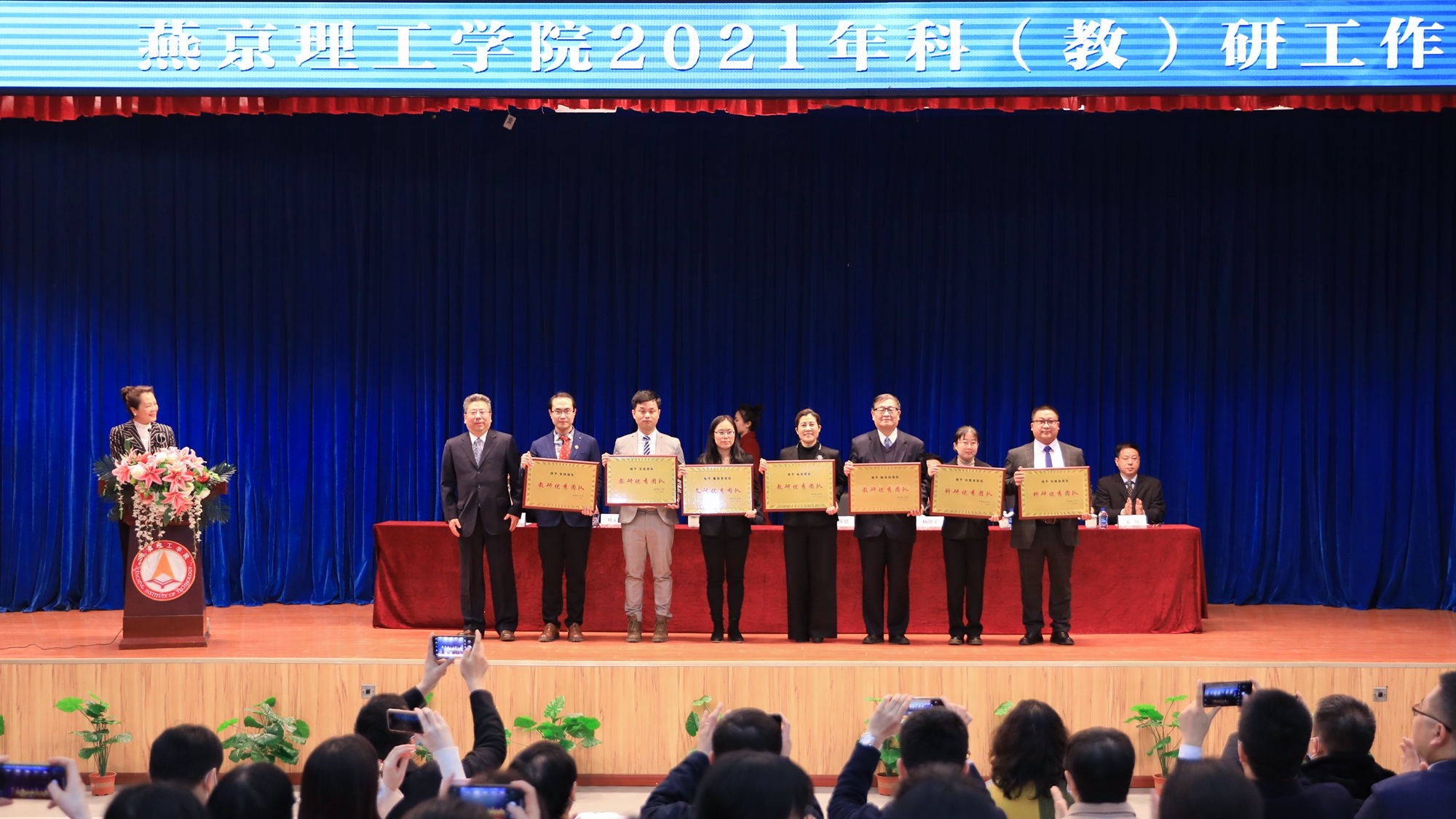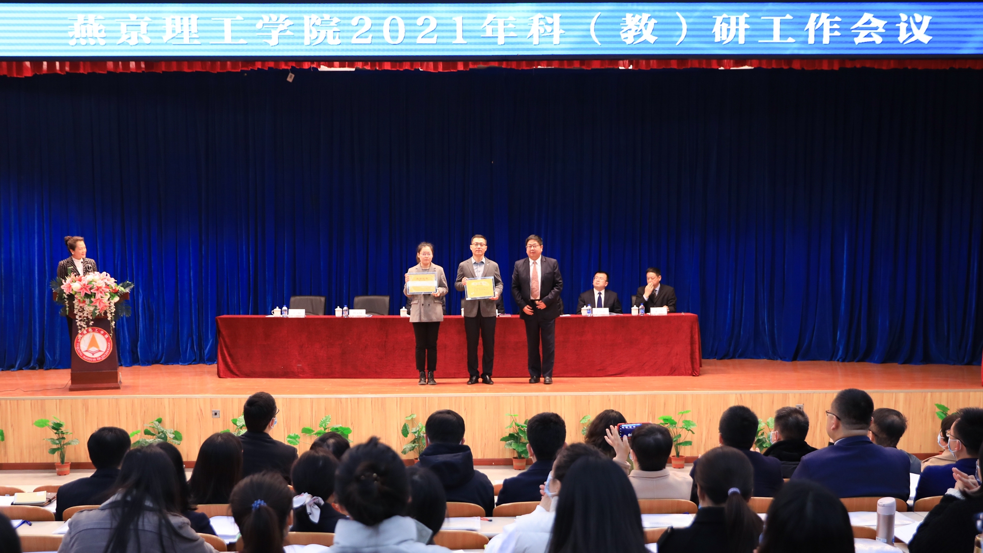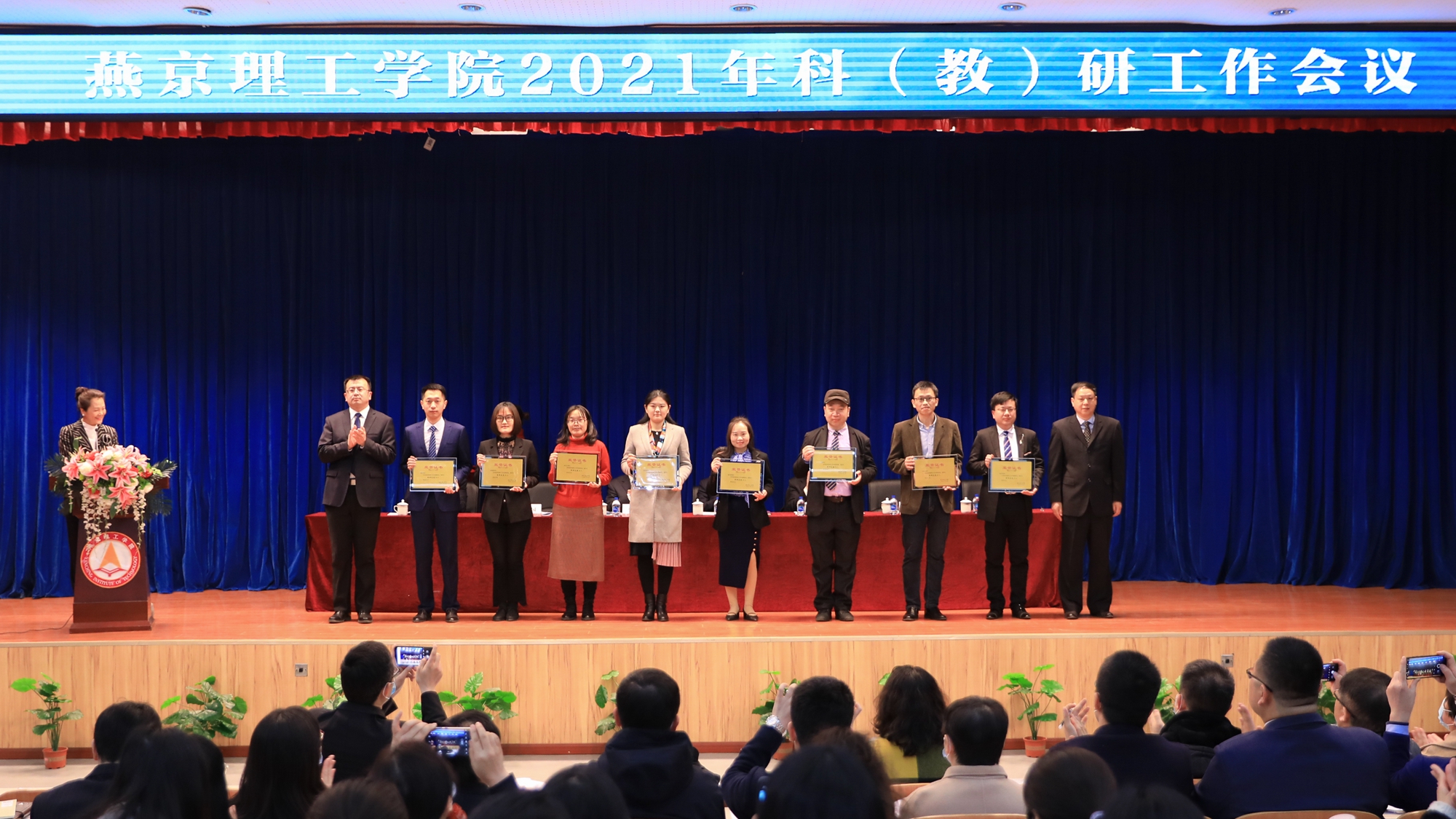 党委书记朱代春宣读了《燕京理工学院关于表彰科研(教研)优秀团队与先进个人的决定》,学校对在科研教研工作中取得优异成绩和做出突出贡献的7个优秀团队和10名先进个人进行了表彰,学校与会领导进行了颁奖。刘继超团队(自动化控制研究)、刘雪凌团队(天然活性物质研究)、陈仲利团队(英语教学研究)、杨良团队(会计类人才培养和教学改革)、廉国恩团队(应用型商科人才教育教学研究)、沈宏团队(以赛事助推设计类人才培养)和张炜团队(传媒专业产教融合实践研究)获评科(教)研优秀团队称号,刘军凯、冯献起、陈旺、荣华英、郑建楠、陈凡红、杨绍娟 和 霍达获评科(教)研先进个人称号,刘鹏飞、陈茜获评科(教)研组织管理先进个人称号。