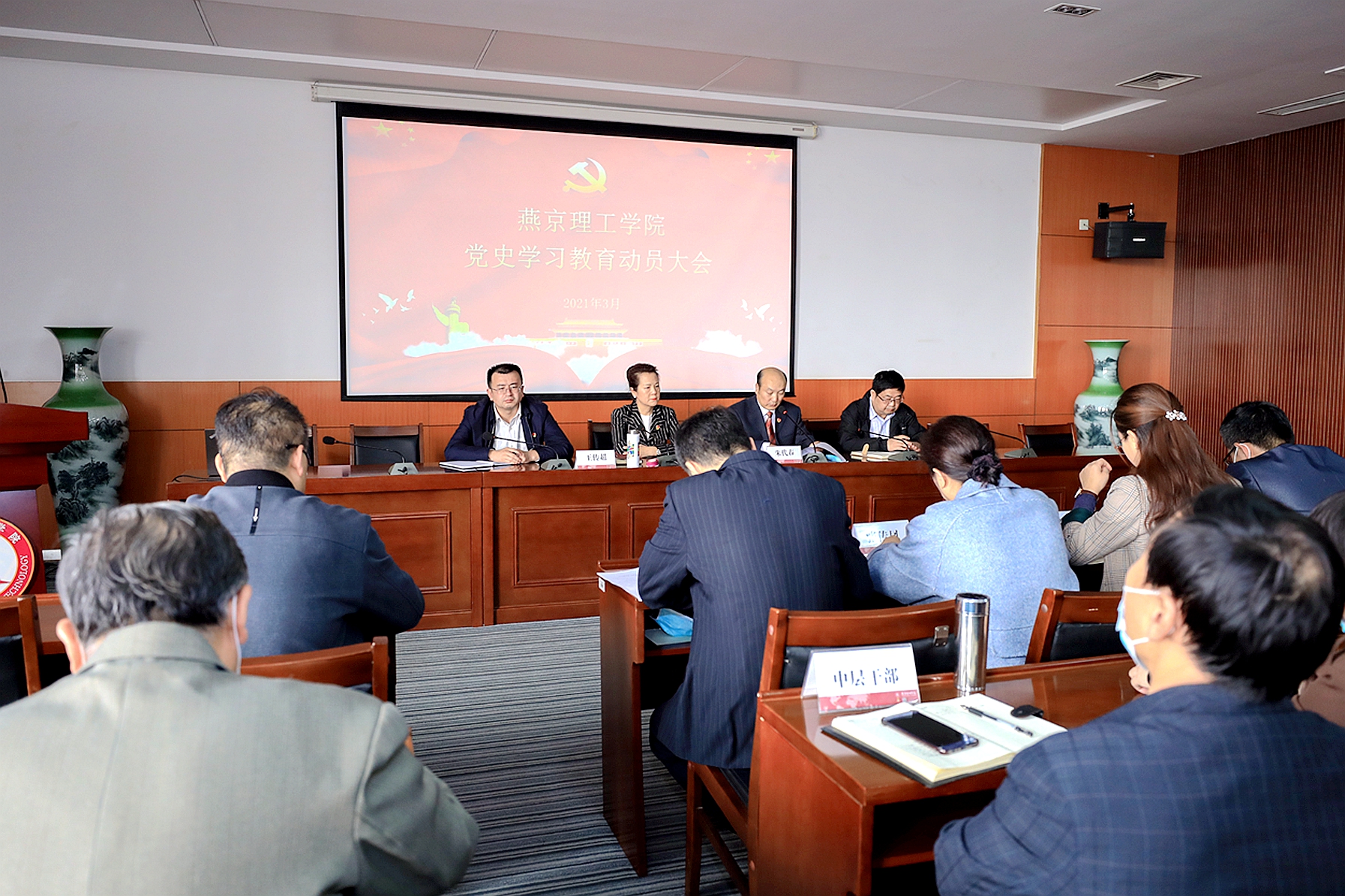 本网讯(校办 白昊旭 任怀民)3月10日,燕京理工学院召开党史学习教育动员大会,学校领导朱代春、刘元园、王传超、吴敏,全体中层干部,各党总支组织委员、宣传委员及全体党支部书记共同参加了会议。此次会议认真贯彻落实中央、省委、省委教育工委和廊坊市教育工委有关部署要求,在全校范围内,深入学习习近平总书记在党史学习教育动员大会上的重要讲话精神,积极动员燕理师生从党的百年伟大奋斗历程中汲取继续前进的智慧与力量。