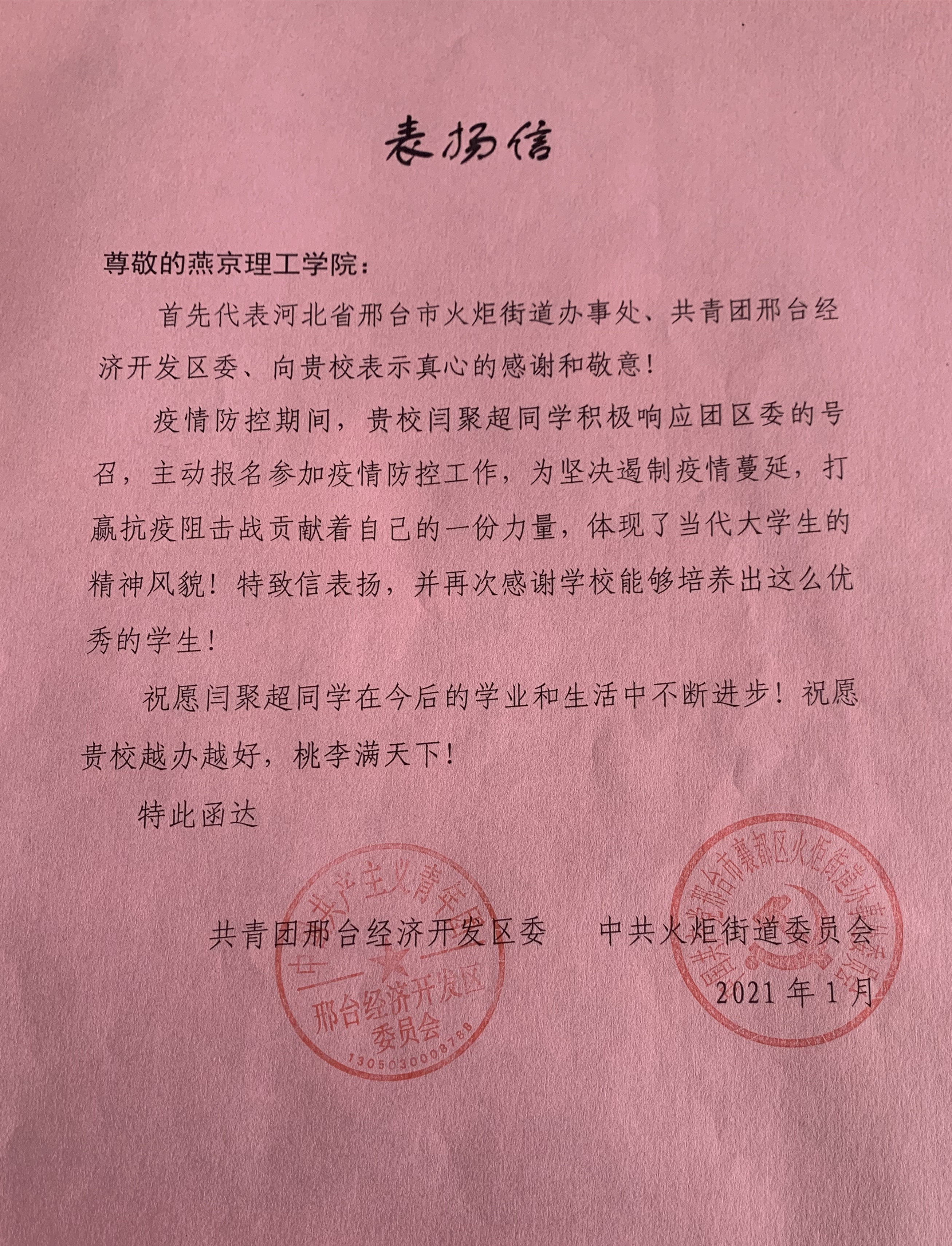 共青团邢台经济开发区委、中共火炬街道委员会为法学1901闫聚超颁发表扬信
