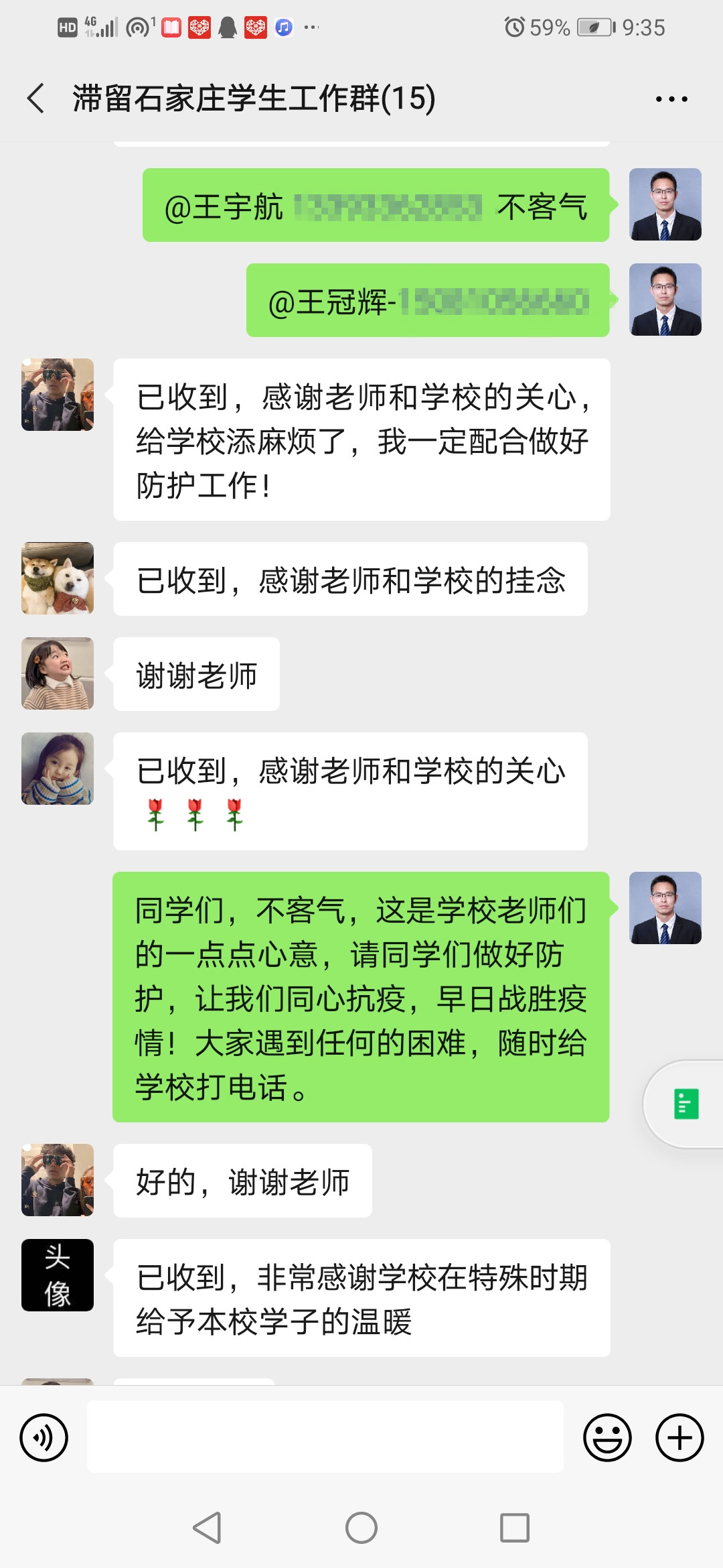 学校在第一时间针对滞留石家庄学生情况进行了全面摸排,以辅导员为骨干力量对滞留学生建立了“一对一”包联制度,建立健康档案,组建专项工作群,通过微信、电话等方式每天保持与学生的联系,时刻掌握基本情况,指导学生做好自我防护,做好心理安抚工作,为学生排忧解难。