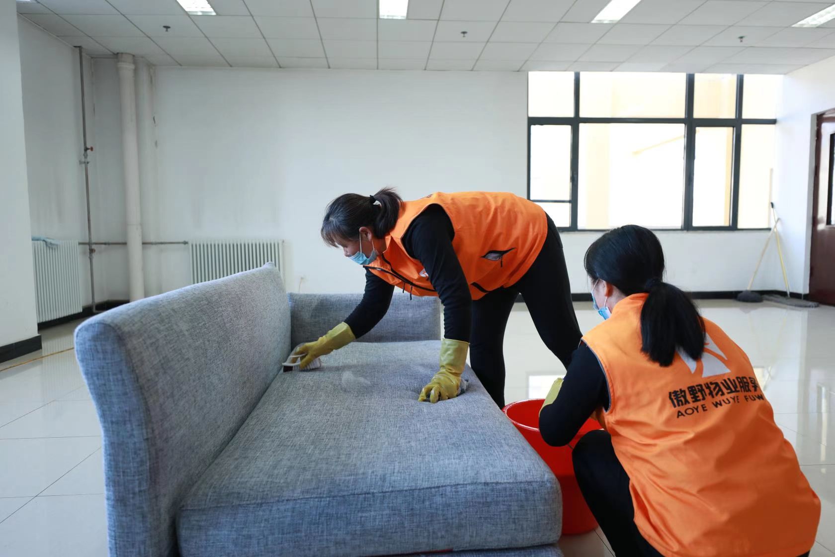 保洁组进行的是布艺沙发的翻新与保养科目。选手按照标准化作业流程熟练地对布艺沙发依次进行吸尘、除渍、擦洗、吸干等工艺操作,配合默契。