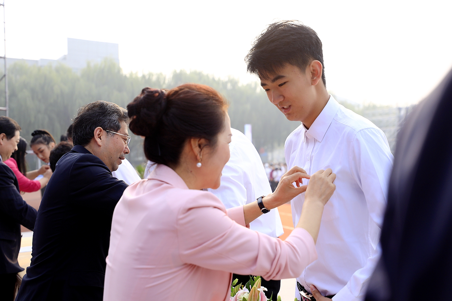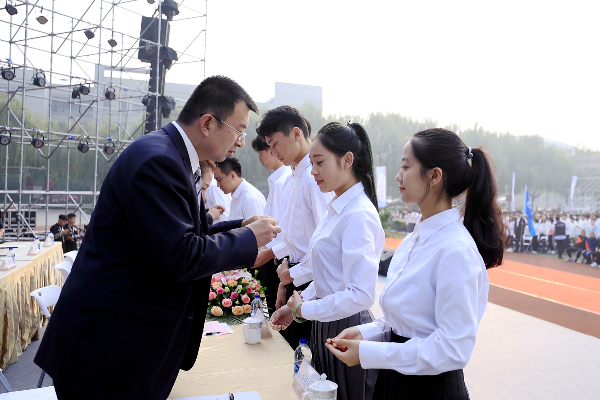 典礼现场,学校领导为新生代表佩戴校徽,全体新同学以求知之心、敬畏之心接受校徽,聆听师长的殷殷教诲。校徽是学校的品牌标识和文化积淀,一枚闪亮的校徽,承载着一代代燕理人的挚爱和情怀,将记录着同学们大学四年的成长成才,成为同学们大学生涯中最为珍贵的纪念。