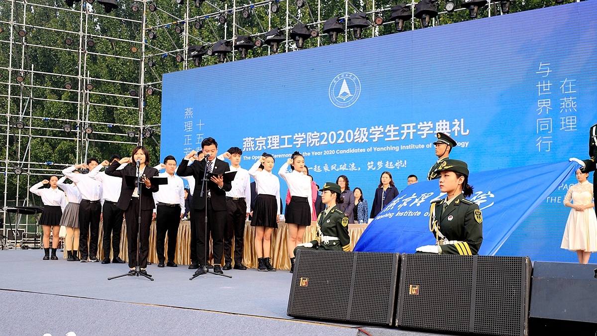 优秀校友代表,国际商学院2018届就业明星、现任百度高级运营经理的王政和会计学院2019届考研明星、现就读首都经贸大学研究生院的袁平为新生领誓。全体新生面向校旗光荣宣誓:作为燕京理工学院学生,秉承校训,勤奋创新璞玉成器,尊师重道,坚守初心,格物致知,命运与共,团结拼搏,永争第一,争做会学习、会做事,会做人、会与人共处;有感恩知心、有博大胸怀,有吃苦精神、有创新意识,有创业能力的社会精英、时代新人,追求卓越进步,励志青春报国,担当时代责任,肩负伟大使命,献身民族复兴!