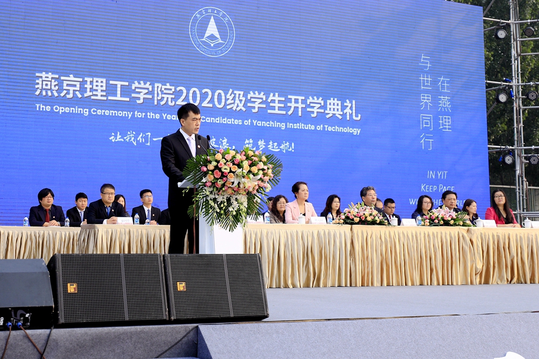 本网讯(校办 李家曾 付盛通 任怀民 许琳雅)骏马扬蹄奋进十五载,海棠秋芳喜结八万果。10月9日,在15周年校庆之际,燕京理工学院2020级学生开学典礼在体育场热烈举行,近万名新同学带着对知识的追求,带着对大学生活的无限憧憬,昂首走进燕京理工学院美丽的校园,开启人生新的征程。学校理事长吴保德,校长杨庚宇,党委常务副书记、副校长刘元园,党委副书记、副校长王传超,副校长吴汶燕出席典礼,各二级学院院长、党总支书记,各处室负责人,新生家长代表,优秀校友代表参加了典礼。典礼由党委常务副书记、副校长刘元园主持。