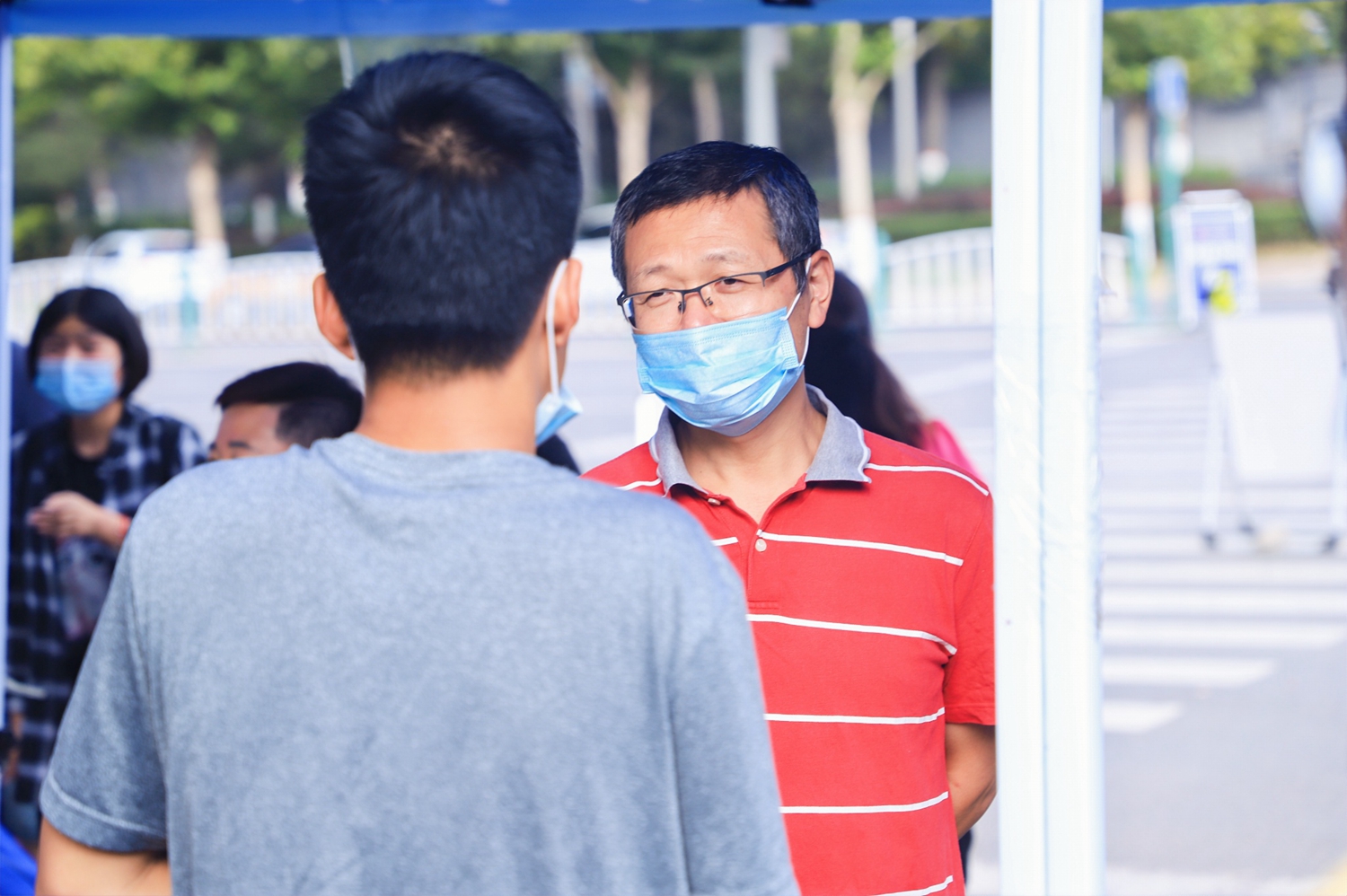 校长杨庚宇在校外家长休息区与新生家长交流。任怀民 摄