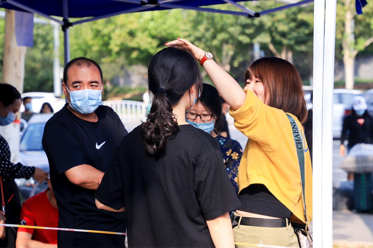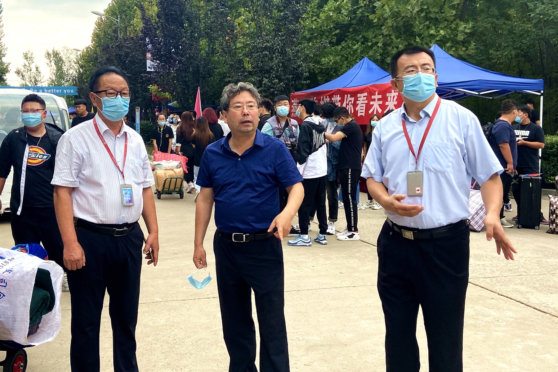 学校领导吴保德、李建英、王传超在学校东门指挥迎新工作。周恩冉 摄
