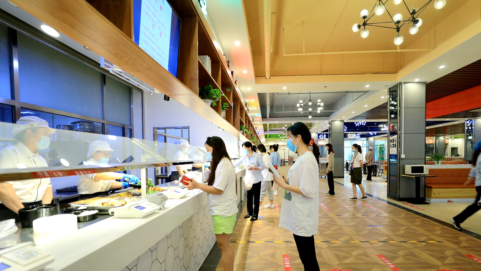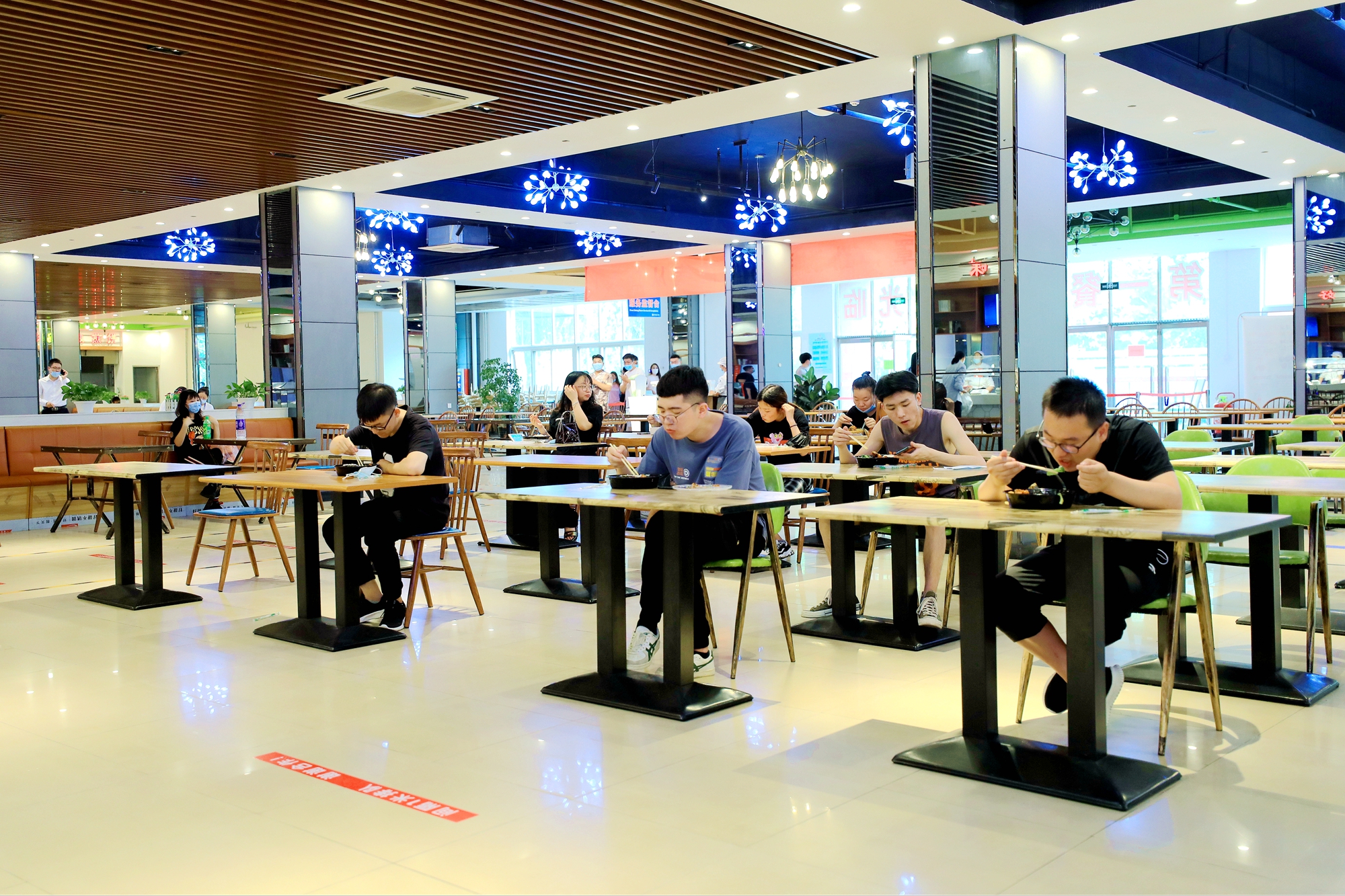 同学们秩序井然的在食堂就餐,品味校园美食