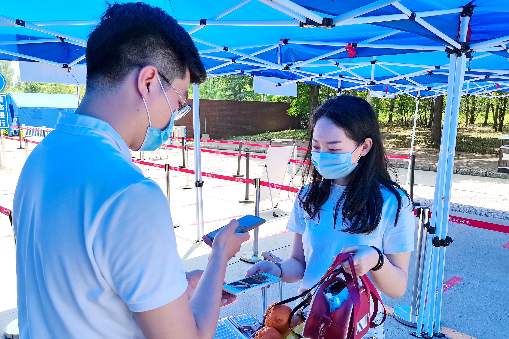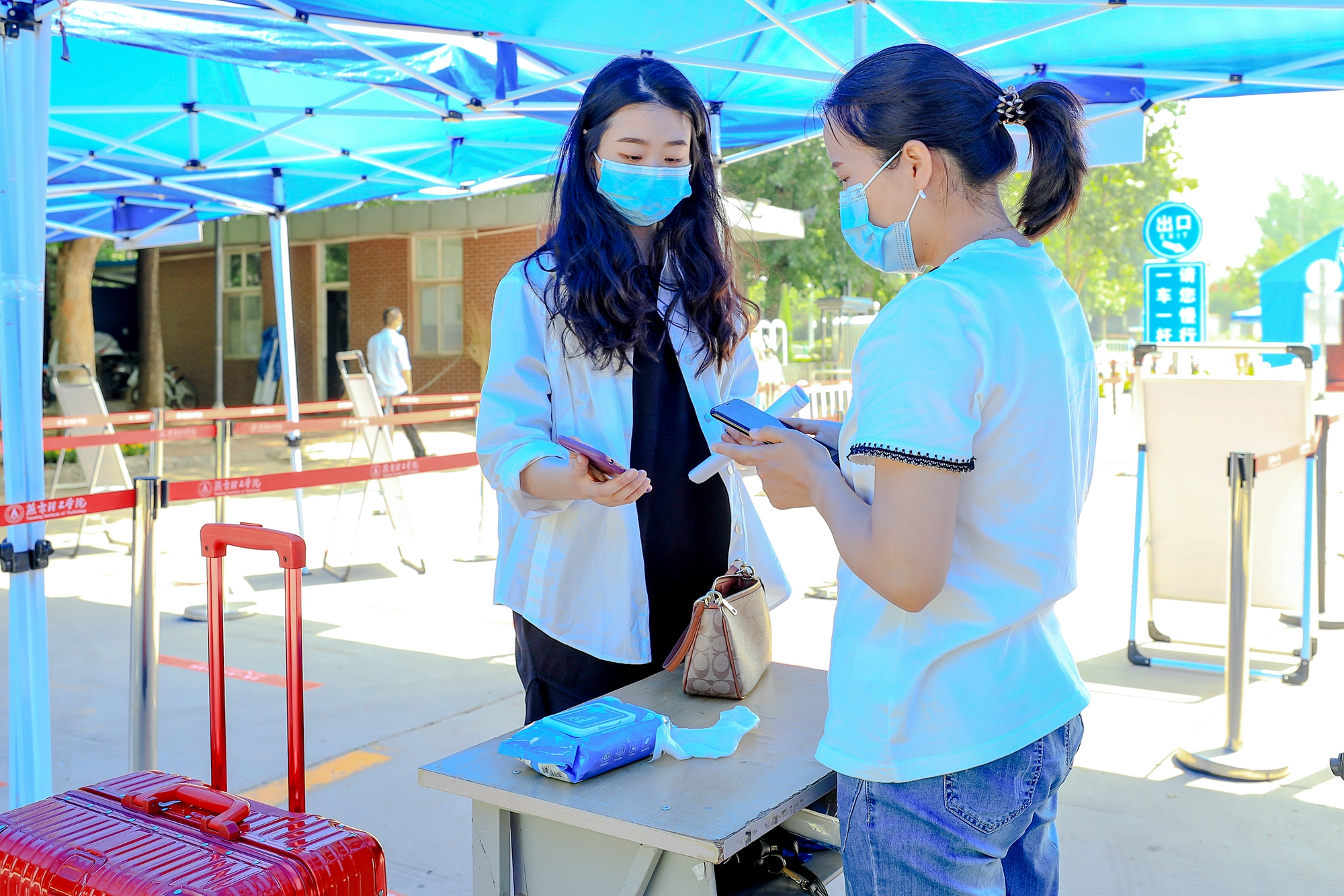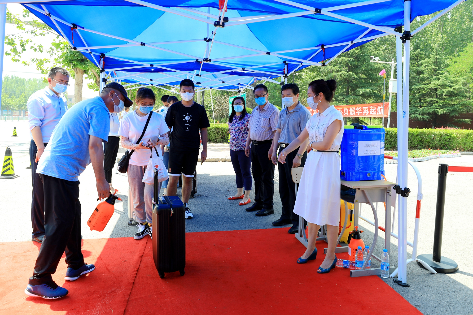 在校门处,学校设置了消毒区、体温测量区、临时观察区、休息区等区域以及自驾和公共交通入校通道。同学们在工作人员引导下,排队进行行李消毒和体温检测,核验“返校确认码”,有序进入校园。
