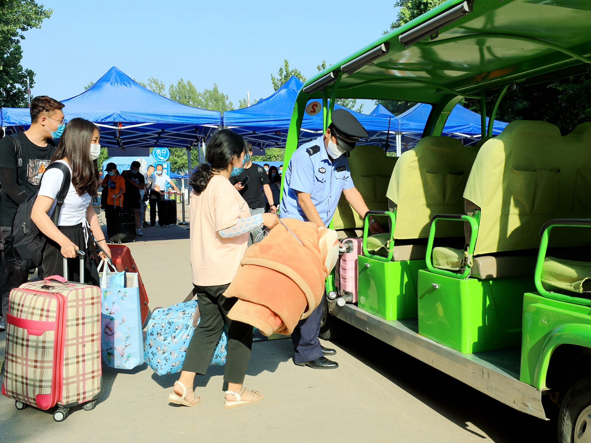 学校经过多方沟通,借调了观光摆渡车组成“爱心”车队为同学们提供服务。进入校内,同学们坐上观光车,载上行李直奔宿舍,在休息之余还可以重温校园的美好风景。