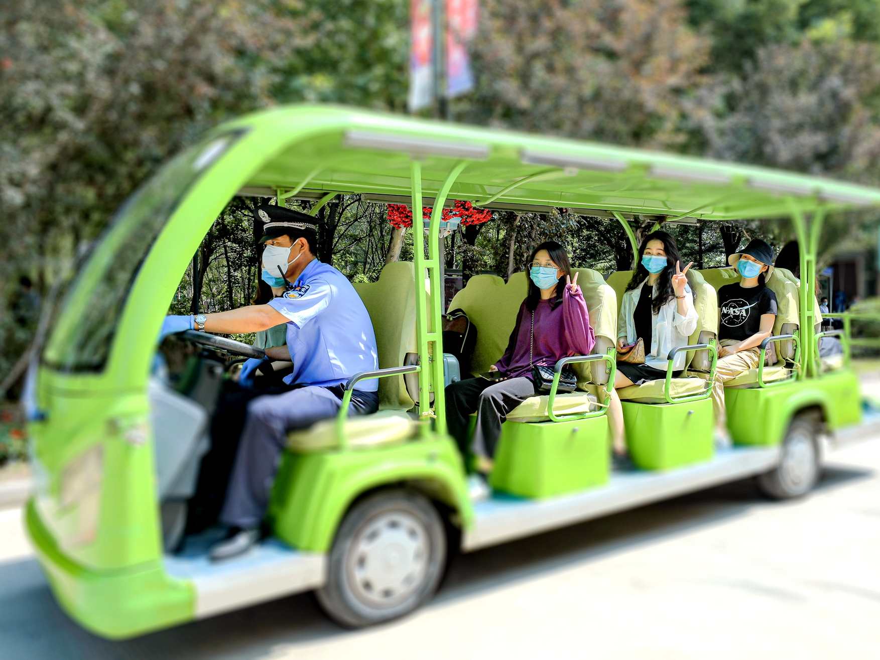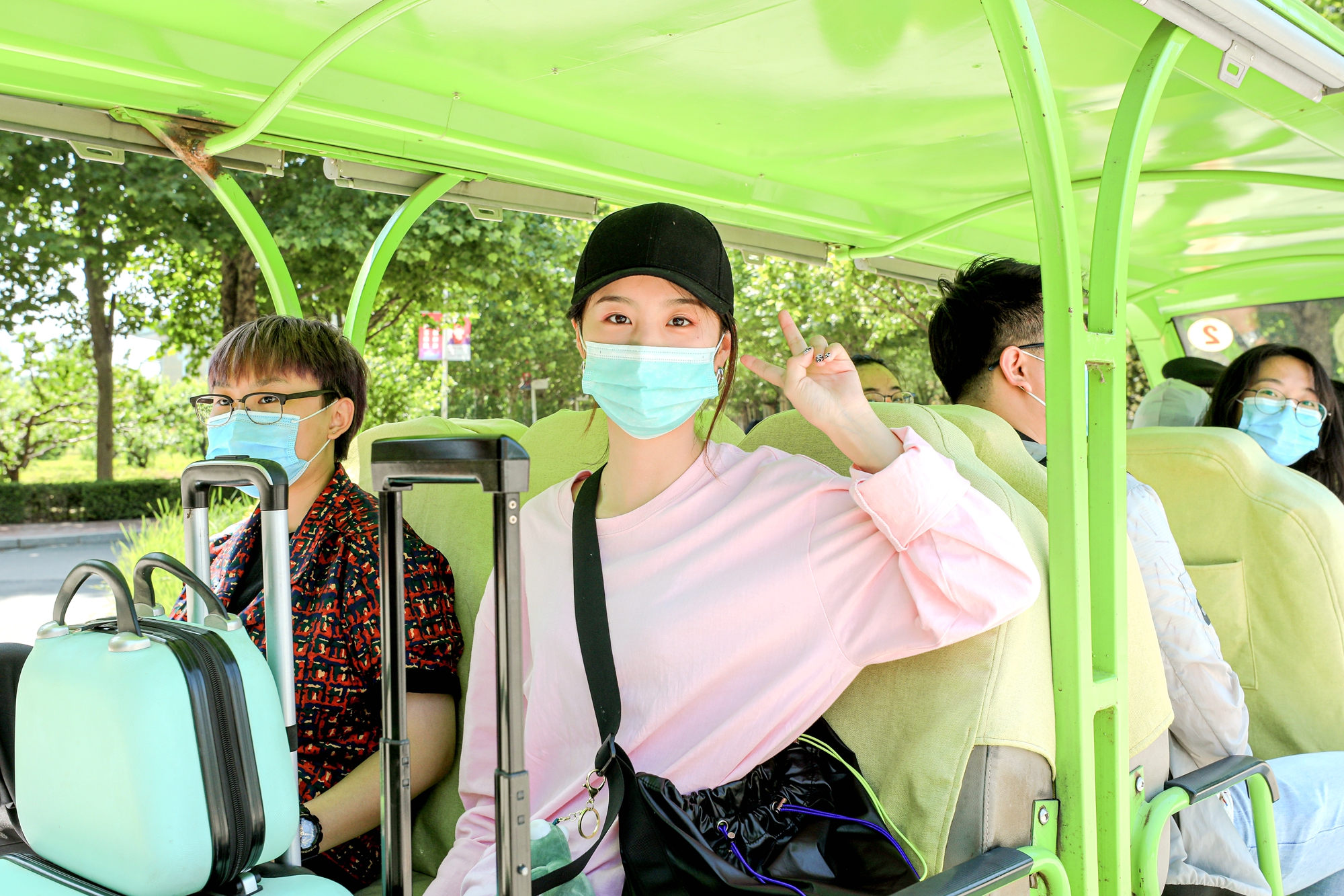 同学们坐上观光车,重温校园的美好风景