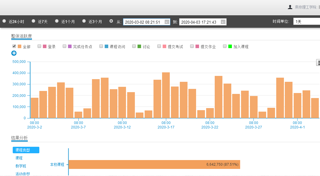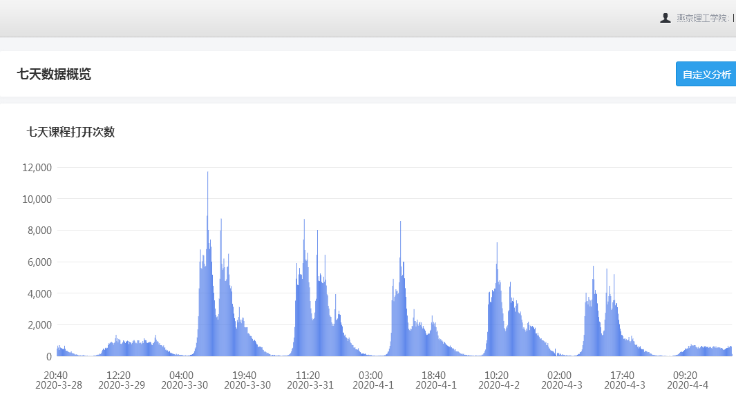 学校“云开学”首月,在五个团队的分工协作、紧密配合下,线上教学运行平稳有序,教学内容丰富,保证了在不降低学习效果的前提下稳步推进教学进度。截止目前,全校共开设线上课程534门,占本学期课程的76.5%,学生通过线上学习人次达379604人次,平均到课率达到97.9%。