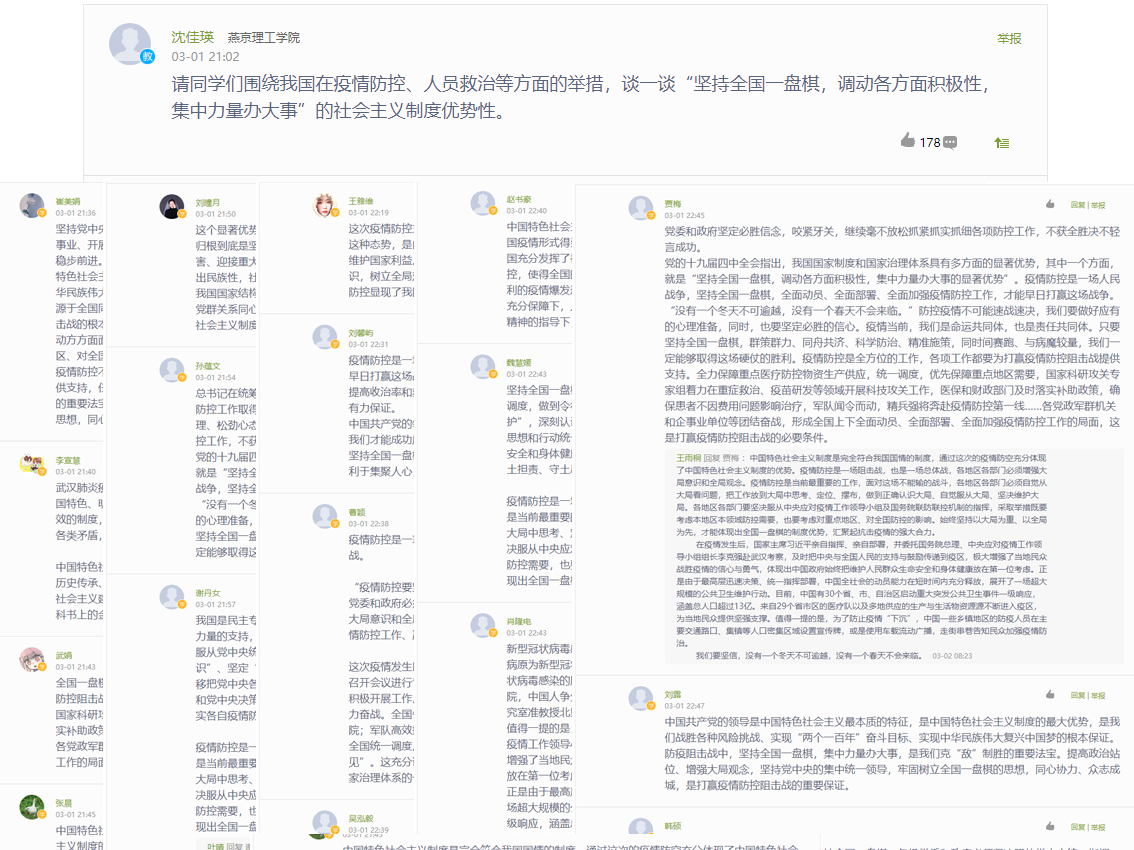 杨庚宇校长深情地告诉同学们,从抗击疫情开始到现在,一个多月的时间里,我们被太多的抗击疫情一线英雄的事迹所感动,祖国一方有难、八方支援的民族团结精神和爱国精神更加彰显,中国速度、中国效率让世界震撼,党在面对重大风险挑战时的“主心骨”“定盘星”作用首屈一指,充分体现出了国家“坚持全国一盘棋,调动各方面积极性,集中力量办大事”的社会主义制度优势性。在以习近平同志为核心的党中央统一领导、统一指挥下,全国人民齐心协力,全力打赢这场疫情防控阻击战、总体战。中华神州大地从东到西、从南到北、从城市到乡村、从单位到个人,众志成城、团结奋战,筑起一道道阻击疫情蔓延的封锁线。