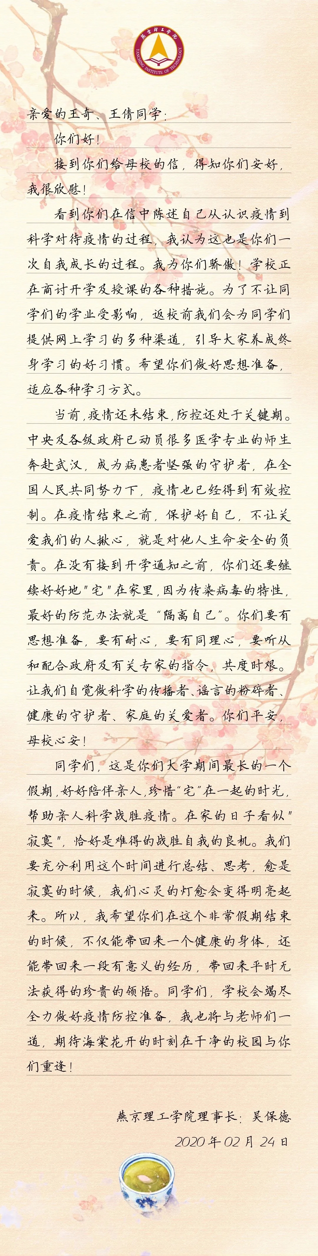 理事长吴保德教授给湖北籍学子回信:与同学们相约在燕理海棠花开的时刻