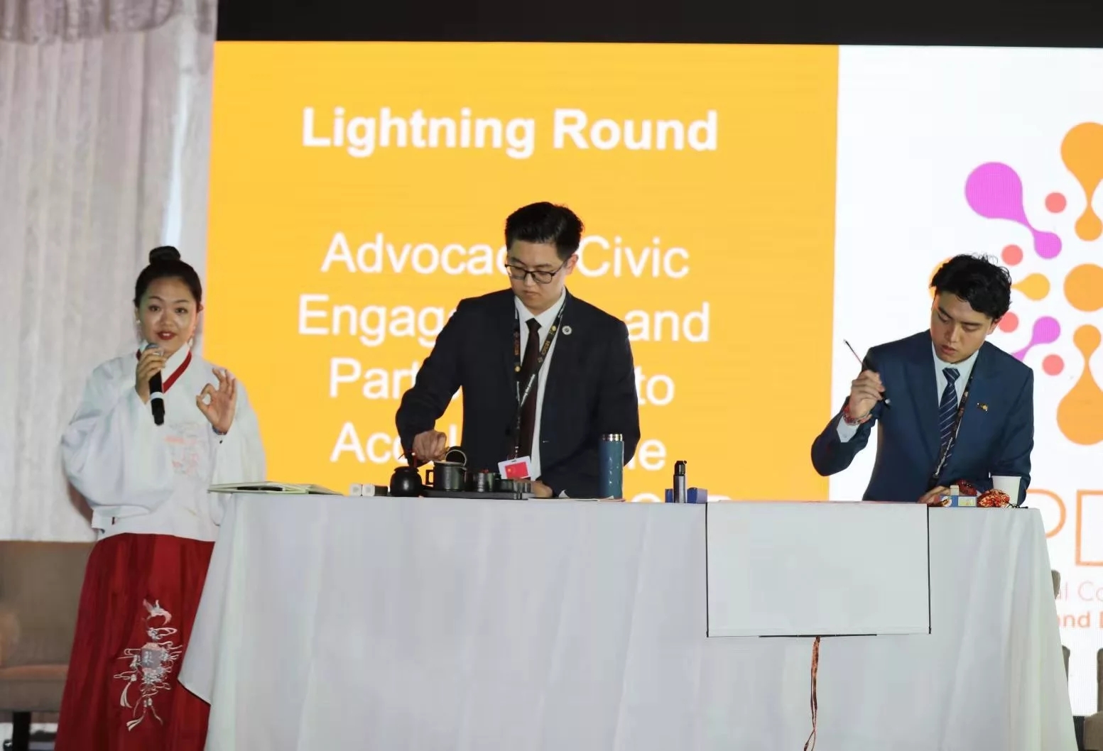 当天晚上,举行了国际人口与发展大会25周年纪念峰会主题宴会,三位校园大使与来自美国、丹麦、印度等国家的参会代表们共同讨论女童保护、性别平等、人口老龄化等多项议题,各国代表也对三位大使在论坛上的分享与展示给予了赞扬。李丹阳为参会的非洲朋友精心准备了寓意吉祥如意的“中国结”。