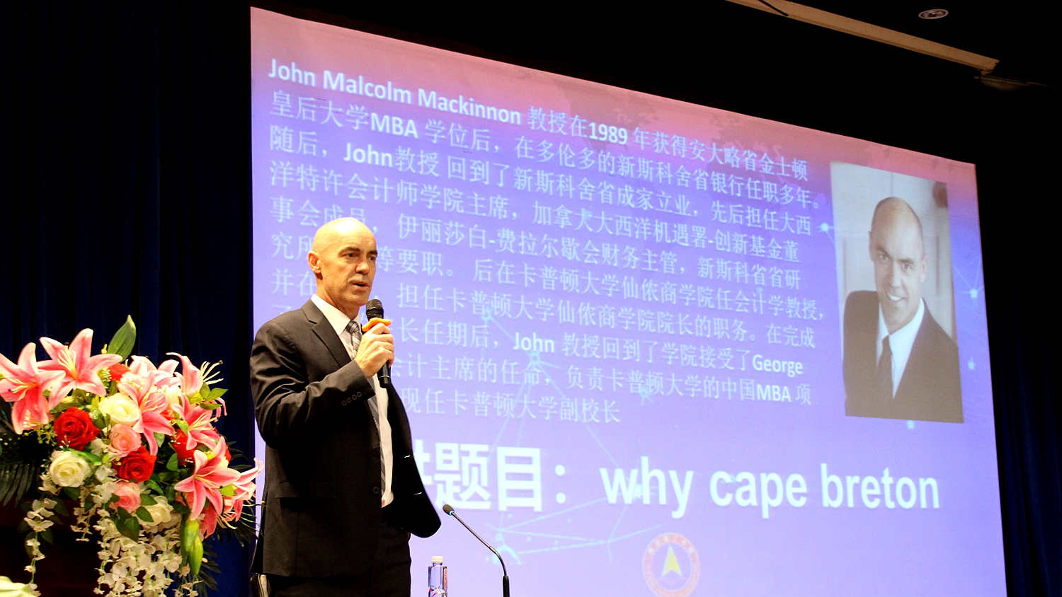 加拿大卡普顿大学副校长约翰·马金农教授开始了题为“why cape breton”的主题演讲。过程中,各位同学与约翰·马金农教授积极互动,马金农教授将远道带来的加拿大手工巧克力送给答对问题的同学,现场氛围热烈活跃。接下来,马金农教授着重介绍了卡普顿大学的王牌课程——双语MBA,旨在培养具有社会责任感和全球视野的高级管理具者与未来商业领袖,兼理论与实践的教学模式。