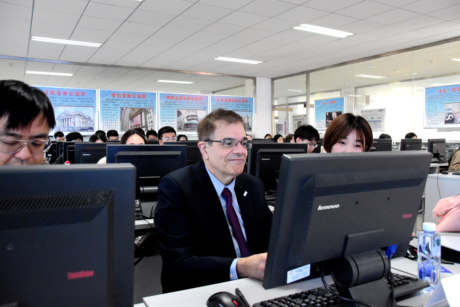 在经管实验室,会计学院师生带领加拿大卡普顿大学仙侬商学院院长乔治·卡拉菲利斯教授进行参观,并开始“SAP”课程实验课展示。卡拉菲里斯教授对我校会计学院财务综合实训课的授课形式和课堂效果十分认可。乔治教授热情地与学生互动交流,认真回答了同学们有关“SAP”课程 、文化差异等方面的问题,并希望同学们以自己所学回馈于社会,通过自己所能为社会作贡献。